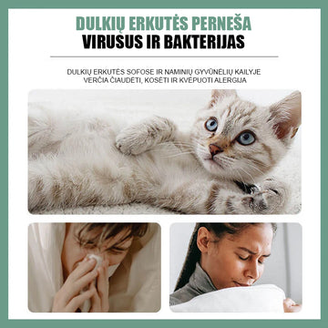 Šis purškiklis gali būti purškiamas ant įvairių paviršių, įskaitant kilimus, baldus, patalynę ar užuolaidas.