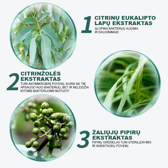 Natūralūs ingredientai, kurie nėra toksiški žmonėms, naminiams gyvūnėliams ir aplinkai.